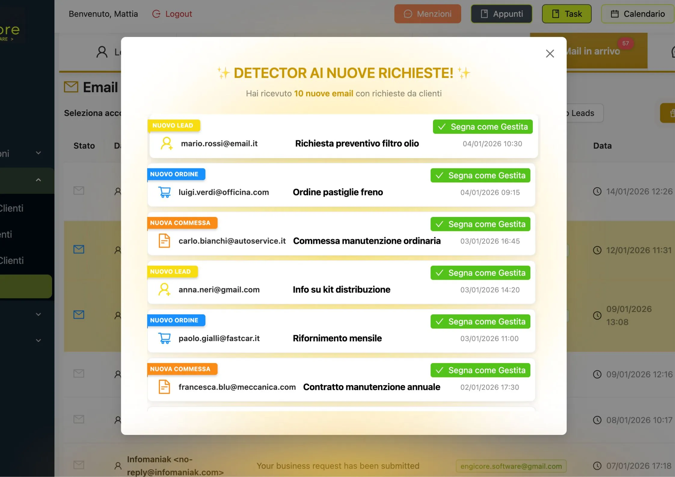 Grazie al pannello AI Detector è possibile vedere velocemente se ci sono mail importanti come nuove commesse, nuovi ordini o nuovi clienti