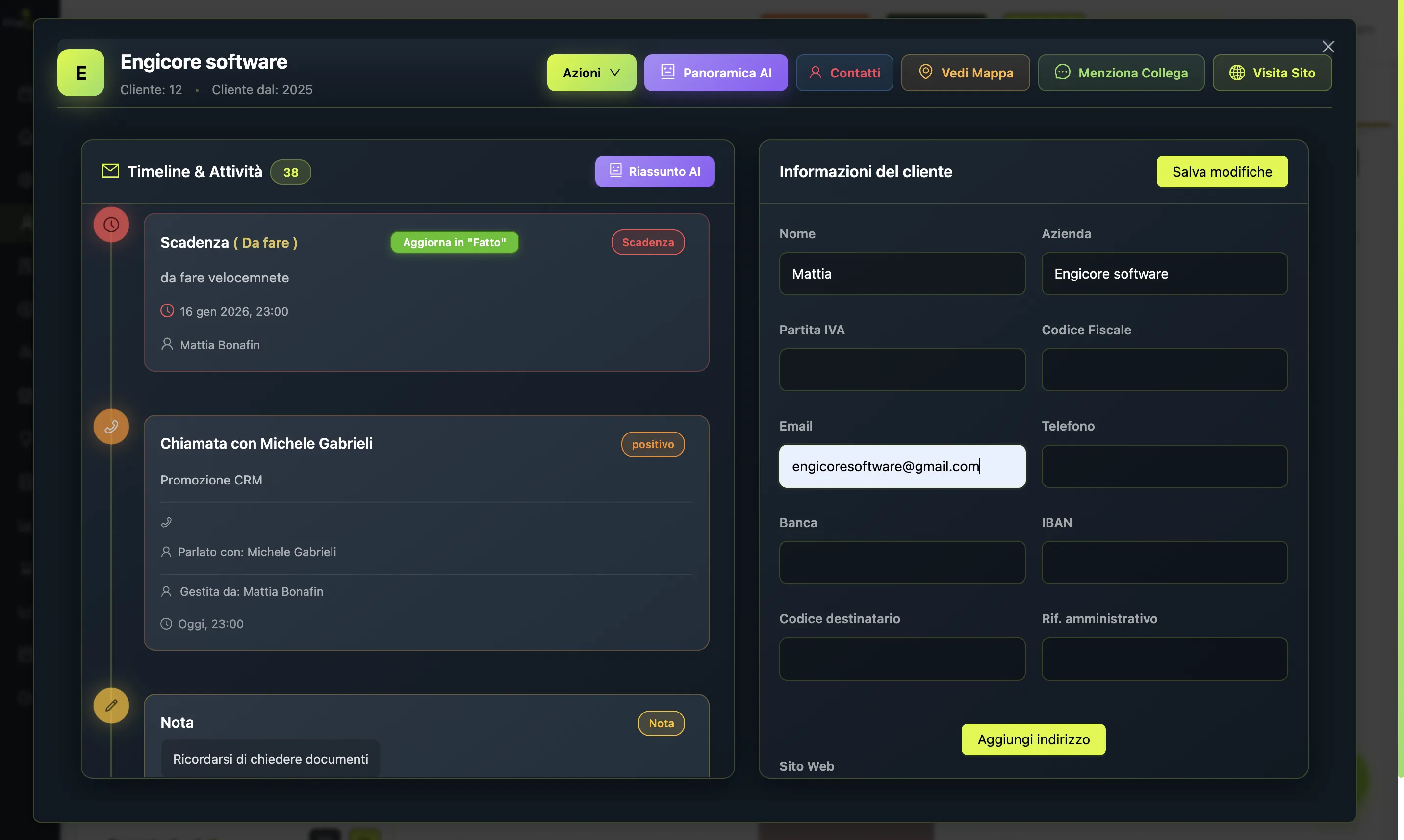 L'intelligenza artificiale ti aiuta nella creazione di mail e template che è possibile inviare a gruppi specifici di clienti. Mentre la scheda clienti ti permette di tener traccia dello storico chiamate, scadenze, note, contatti, appuntamenti e tracciare le aperture e le interazioni alle mail inviate.